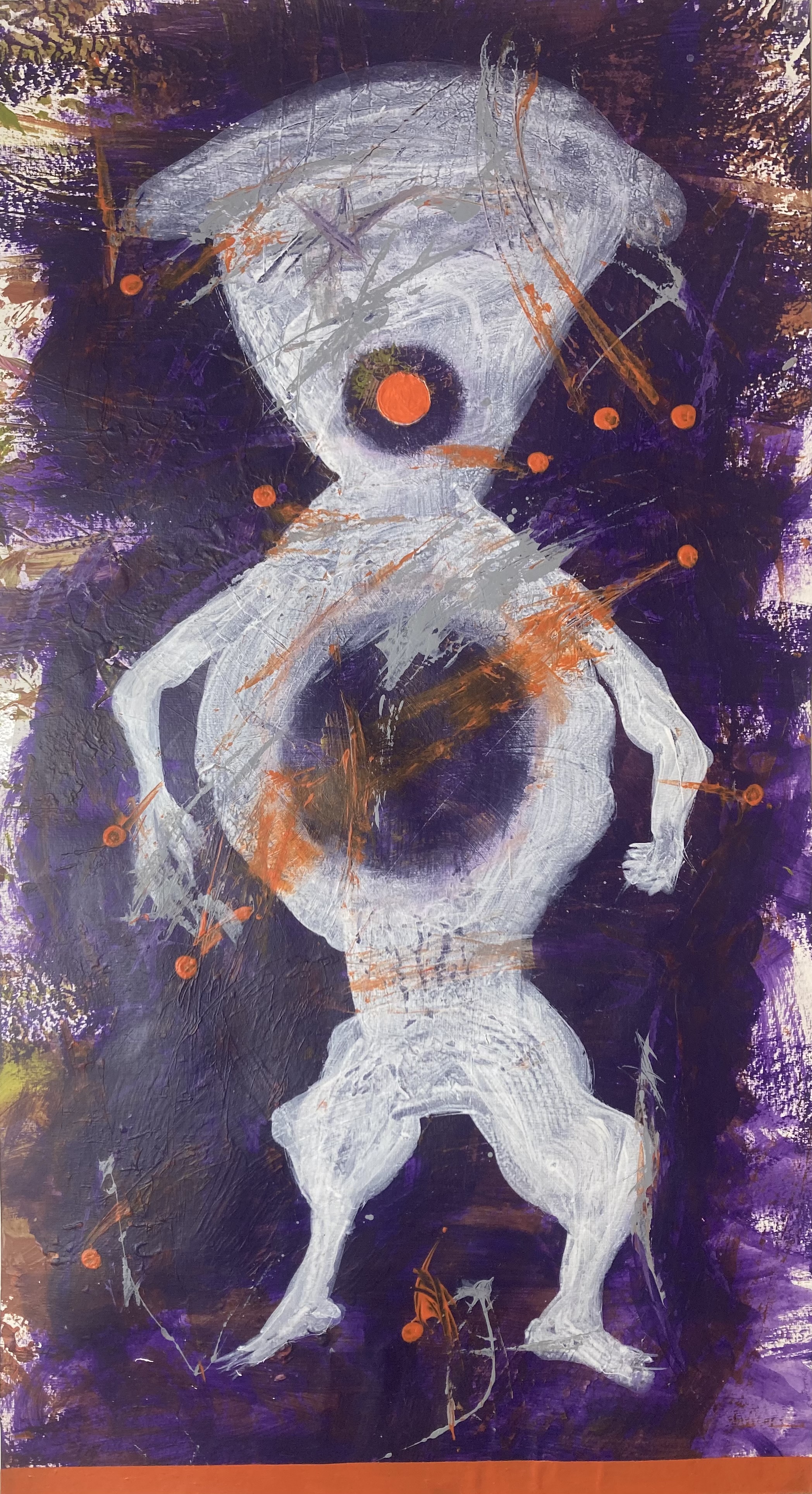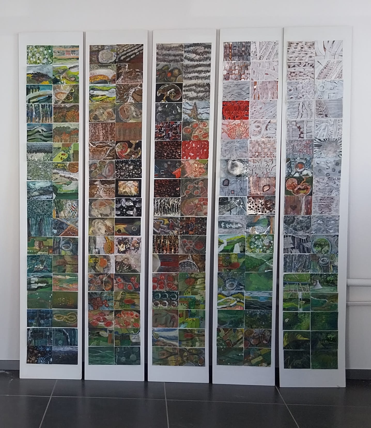 Sie drückt ihre inneren Prozesse in intuitiv gearbeiteten Werken aus. Gerne zieht sie dabei Altbekanntes in ein abstraktes Spektrum- somit wird Munch‘s „der Schrei“ in Form und Farbe übersetzt, entpersonalisiert und zu einem kollektiven Ton der Ohnmacht, inmitten einer turbulenten Welt. In der aktuellen Projektarbeit „Auf-Bruch“ mit 7 anderen KünstlerInnen, fokussiert sich Ungeheuer auf alltägliche Aspekte dieses Themas, wenn die Möglichkeiten begrenzt und der gesellschaftliche Rahmen streng gesetzt ist.